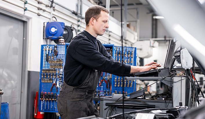 Din elbils batteri er afgørende for langvarig glæde. Faktorer som ineffektiv kørestil, høj hastighed, varme og kulde , kilometertal og opladningscyklusser kan reducere batterikapaciteten. Lad vores højvoltsteknikere tjekke batteristanden. "State of Health" er en analyse af batteriets sundhedstilstand* udført af specialuddannede teknikere med brug af fabrikkens originale tester, der er direkte opkoblet til fabrikken.